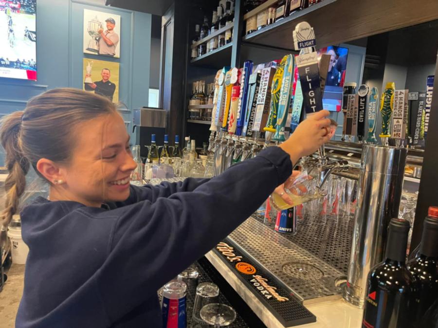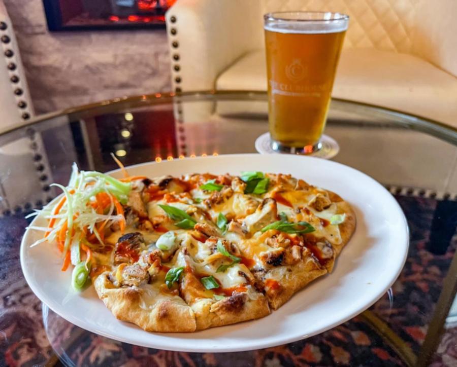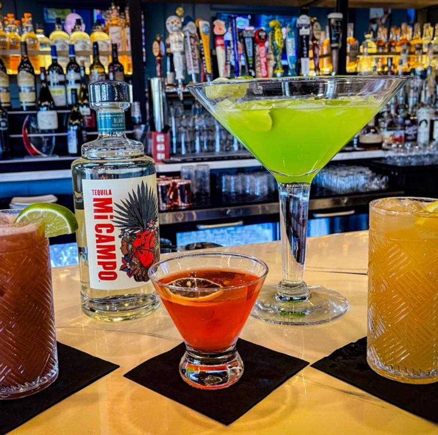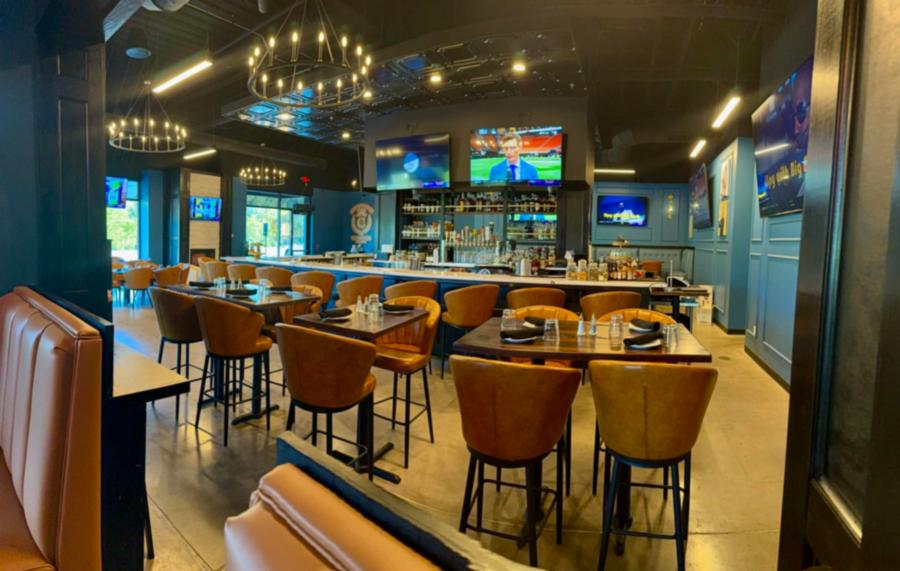 The venue offers a full food and drink menu including wings, burgers, flatbreads, appetizers, cocktails, and beer selections, making it a casual dining option alongside its sports viewing experience.