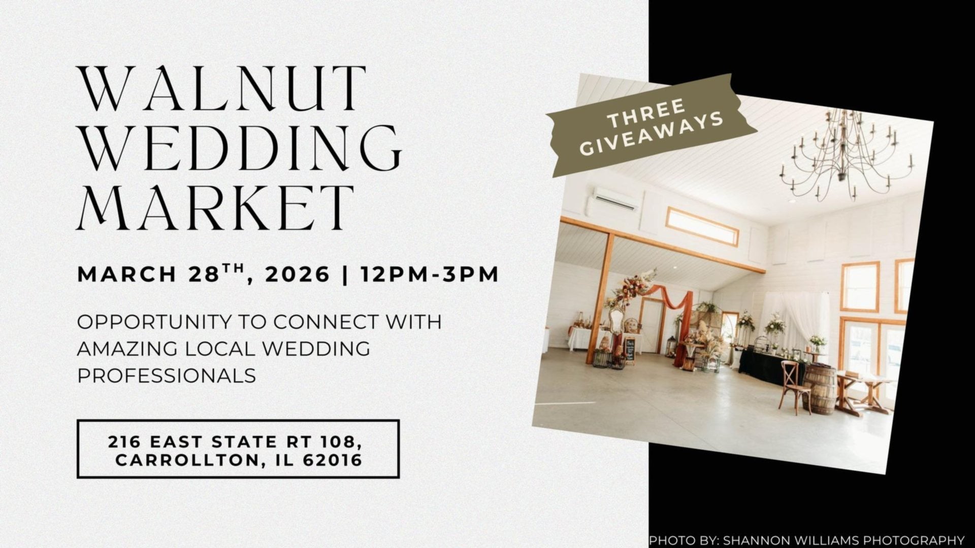 From 12–3 p.m. on Saturday, March 28, 2026, Walnut Hall will host their fourth annual free Wedding Market complete with vendors, a bar, giveaways and more fun. Organizers are still accepting vendors who want to showcase their products, and they are eager to give couples tours of the Walnut Hall wedding venue. But even if you aren’t getting married at Walnut Hall or at all, organizer Paige Foster promises it will still be a fun day.