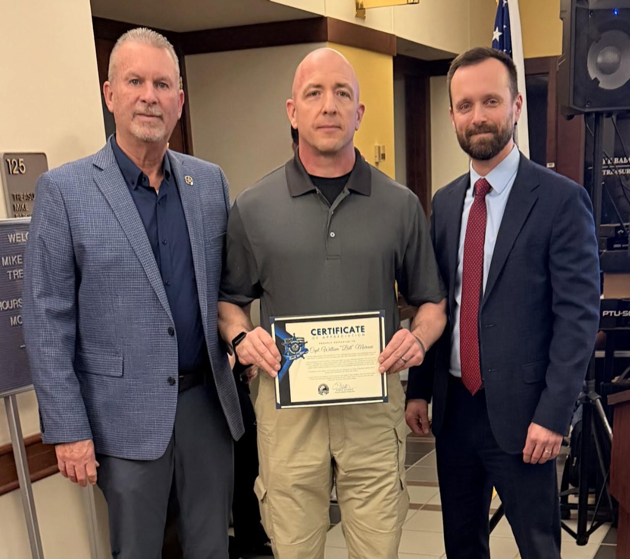 Chairman Chris Slusser presented a Certificate of Appreciation to Capt. William “Bill” Marconi, recognizing his Feb. 13 retirement. Marconi began his career with the Madison County Sheriff’s Office in February 1999 and most recently served as Director of Court Security, a role he assumed in April 2023.