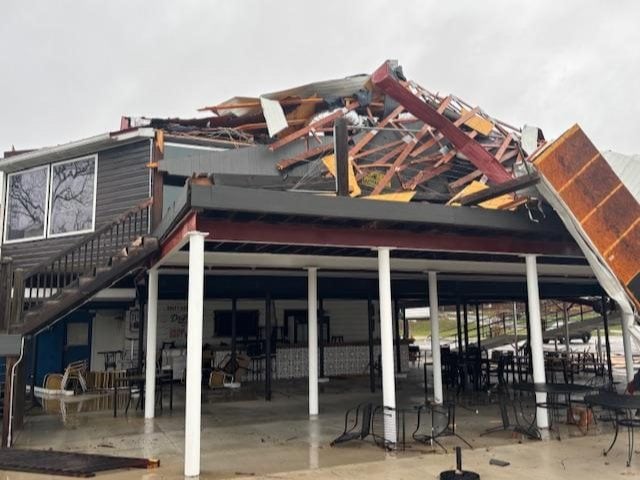 Morrow said debris also damaged nearby properties, including Dee’s Riverside Retreat at 1446 W. Main St. He said a power line came down and that a garage was lifted off its foundation. He also described damage, including broken windows.