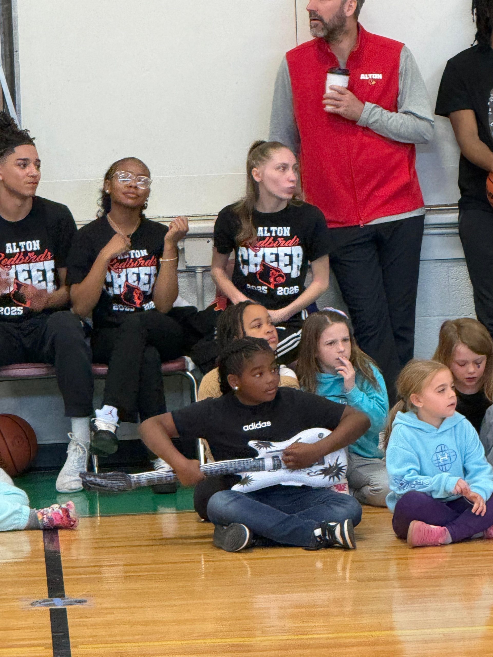 During the pep rally on March 23, students enjoyed a music theme complete with a “Finish the Lyric” game and a musical chair scavenger hunt for teachers. Alton High School cheerleaders and basketball players stopped by to cheer and perform for the elementary schoolers.