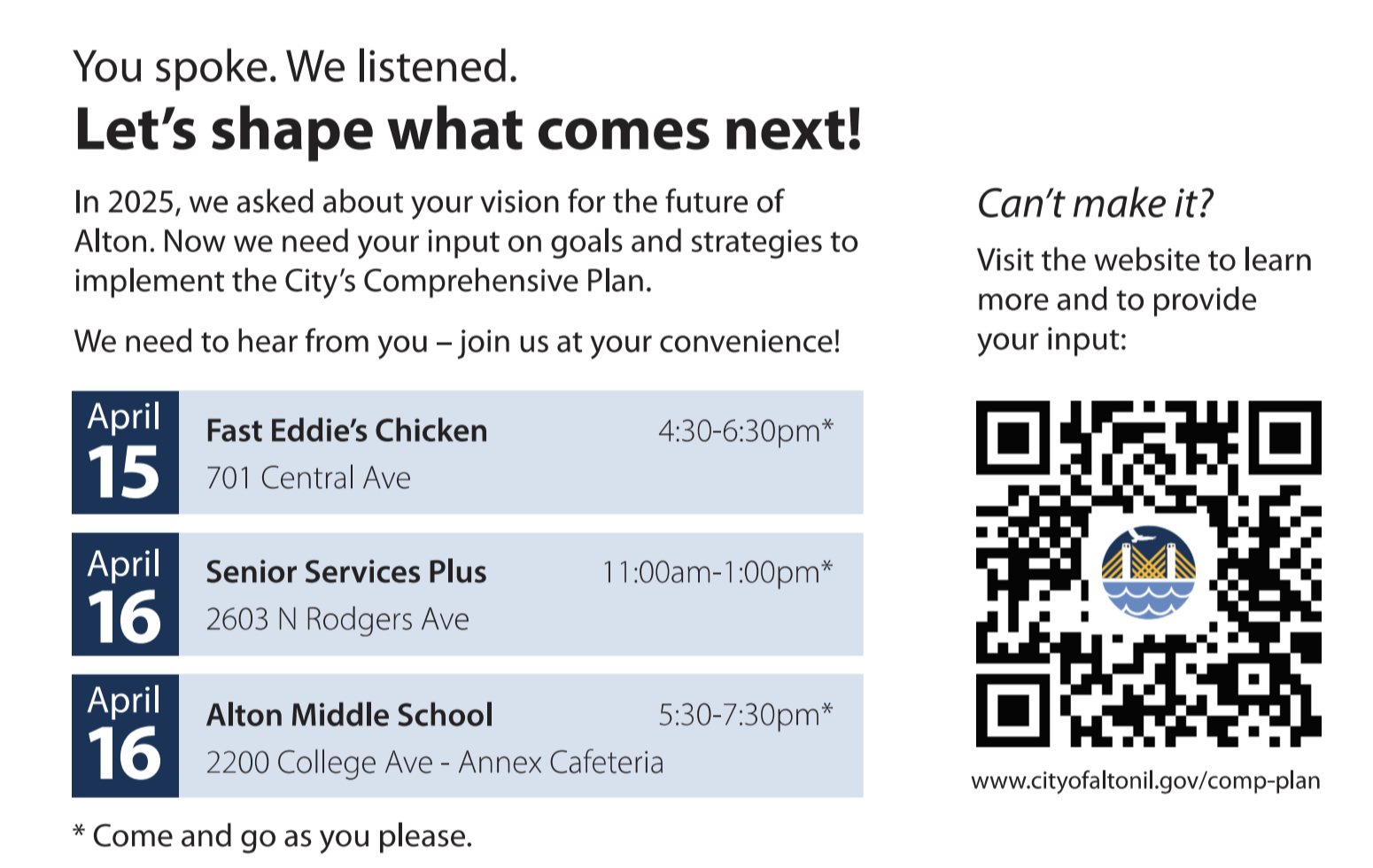 ALTON – The City of Alton is excited to announce the second phase of community engagement for its new 20-year Comprehensive Plan — an important milestone following the first round of workshops and outreach held in October 2025.
