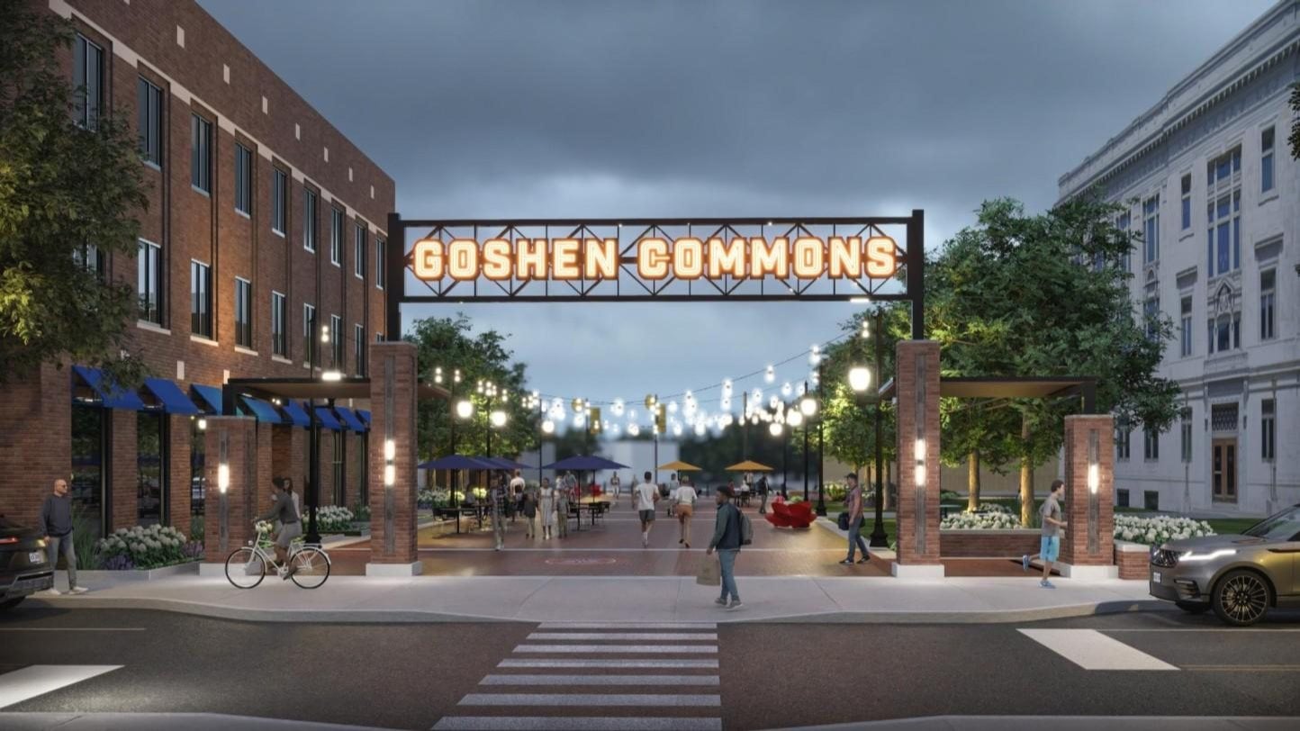 Goshen Commons will repurpose one block of St. Louis Street between North Main Street and Second Street and the adjacent courtyard into a pedestrian-friendly public park. It will incorporate green space, including trees and various plantings; an expansive gathering area; walkways and seating areas; shade structures; festoon-style lighting; a video screen; restrooms and game tables.