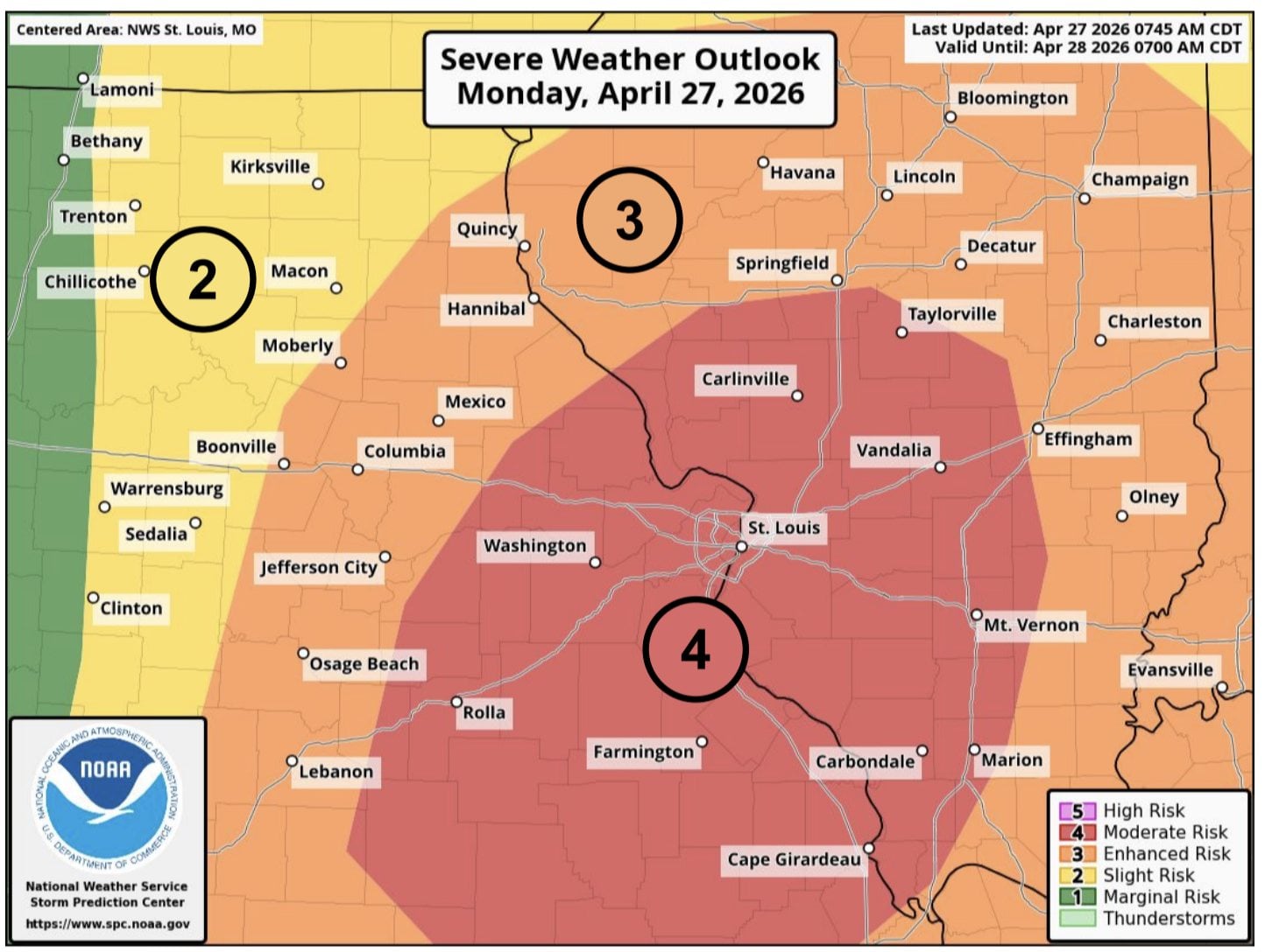 The National Weather Service in St. Louis has upgraded the area to a Moderate Risk, or Level 4, for severe thunderstorms today, with the most likely window for severe weather between 2 and 10 p.m., meteorologist Mark Fuchs said on Monday morning, April 27, 2026. Forecasters said a band of thunderstorms is expected to sag into the bi-state and metro area, especially the north side by midafternoon, then move southward into the late evening.
