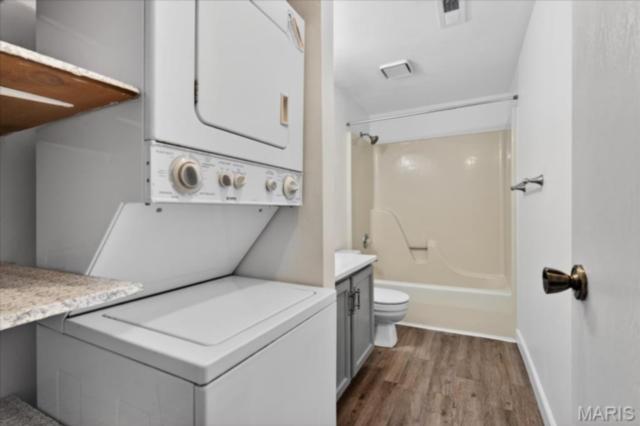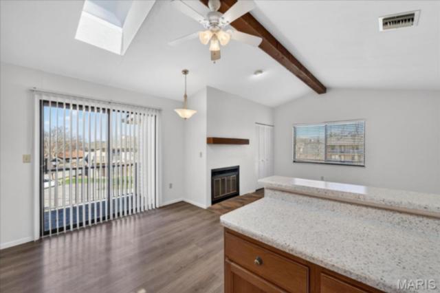 Enjoy maintenance-free living in this beautifully updated 1-bedroom, 1-bath upper-level unit. Step inside to find newer luxury vinyl plank flooring throughout, offering both durability and modern style. As a bright corner unit, it’s filled with natural light and features vaulted ceilings that enhance the spacious, open feel. The inviting eat-in kitchen includes a convenient breakfast bar, ample cabinet space, and newer appliances—perfect for everyday meals or casual entertaining. The full bathroom offers a stacked laundry closet for added convenience. Relax and unwind on your private balcony, ideal for enjoying morning coffee or evening sunsets. Residents can also take advantage of the community pool for leisure and recreation. This home is perfectly located near shopping centers, hospitals, a variety of restaurants, and easy access to I-64 for commuting or weekend getaways. Agent Interest.