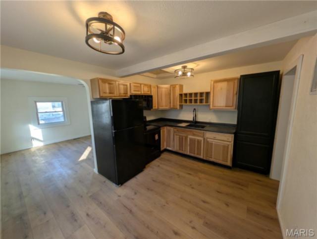 Affordable remodeled 3 bedroom 1 bath ranch style home with detached garage with front driveway parking and extra rear parking off alleyway. Freshly painted interior. Rehabbed bathroom with new fixtures. All new vinyl plank flooring throughout property. New light fixtures and ceiling fans. Open kitchen dining living room layout. Plus all new kitchen hickory cabinets and countertop and designer sink and faucets with brand new appliances included and large pantry cabinet. Mud room area at back door with access to laundry room and new A/C '25. Office area leads to oversized primary bedroom with vaulted ceiling. Nice sized fenced backyard. 20x14 detached garage off alleyway. New 6" gutters around house and garage w/buried draintile '25. Choice Home Warranty 12 month coverage after the sale provided by seller at great price $99,900.