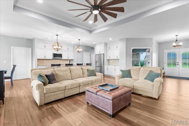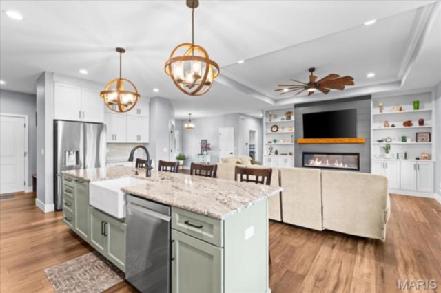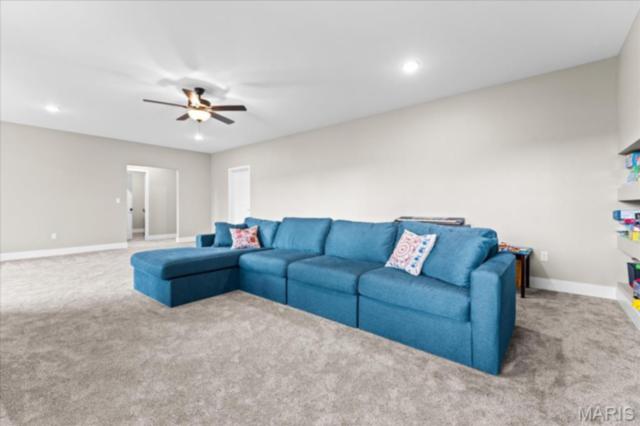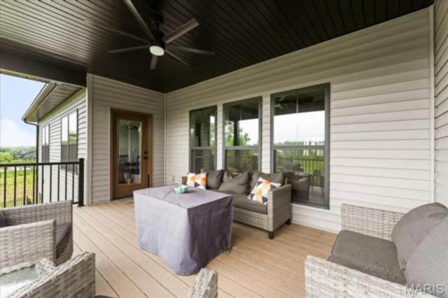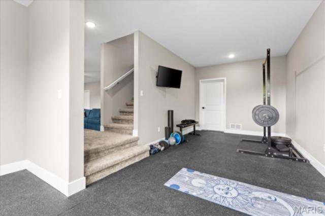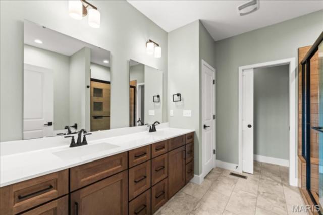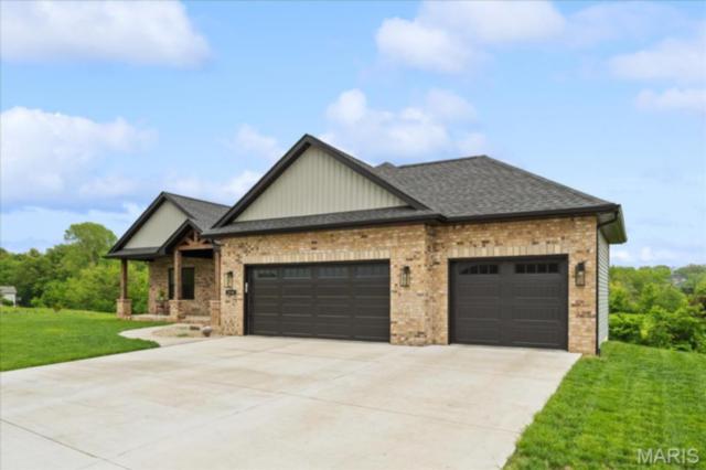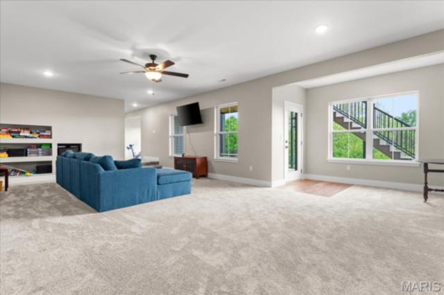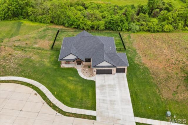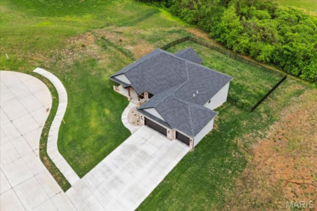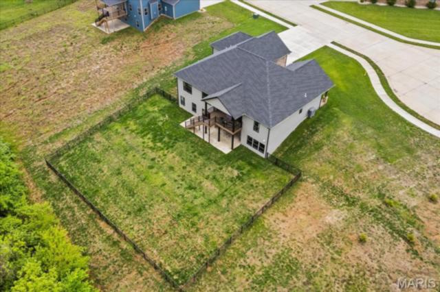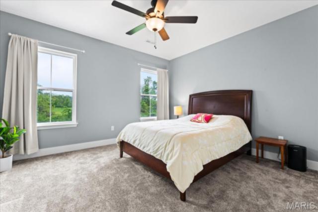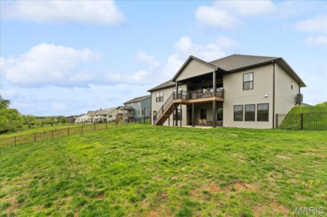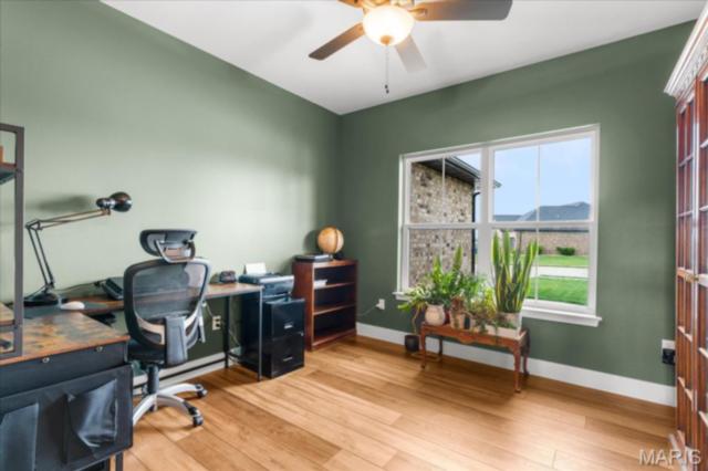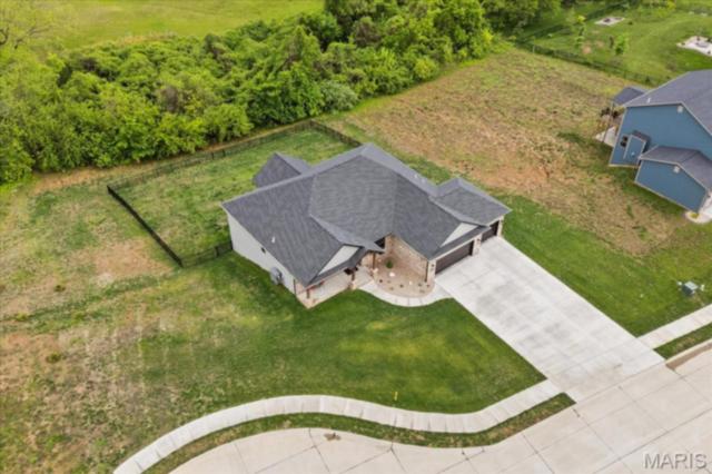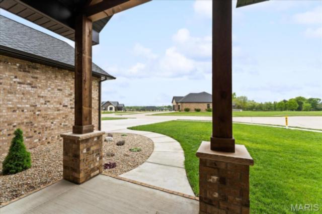 Gorgeous custom built home with a split bedroom floor plan and main level master bedroom. Tons of cabinet space in the kitchen with a large island, all soft close cabinets and drawers throughout, walk-in pantry with custom shelving that gives you lots of storage options, eat in dining area, and all kitchen appliances to stay. The kitchen opens to the spacious living room with electric fireplace and custom built bookcases. Not only are there stunning views from the living room and kitchen, but also from the primary bedroom. The main floor primary bedroom also has a spa-like bath including a walk-in shower with custom tile, garden tub, and a double bowl vanity. The large primary closet has custom shelving and drawers and connects to the laundry room that opens to the drop zone right off the 3 car garage. A front office space with french doors is off of the foyer entry which also leads to the two guest bedrooms along with a second full bath to round out the main floor The walk out finished basement offers an expansive living room, a home gym with rubber mat flooring and great views of the back yard, fourth bedroom, a second office space and a full guest bath. Don't forget about the high end LVP flooring on the main level, an oversized 3 car garage, fence, and upgrades galore. All of this on just over an acre lot on the cul de sac street, minutes to Scott Air Force Base, community pool, Shiloh/O'Fallon schools, along with great views from the back and views of the Arch from the front!