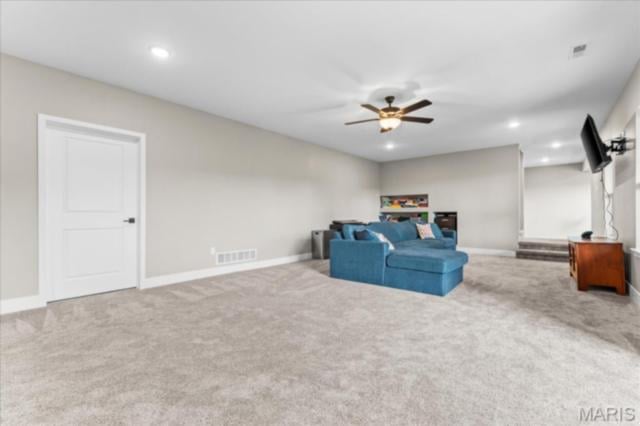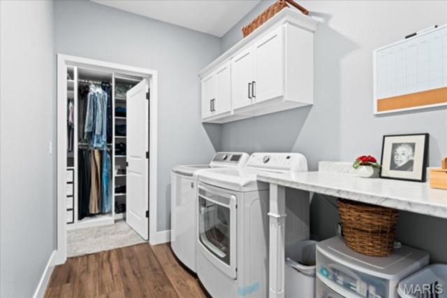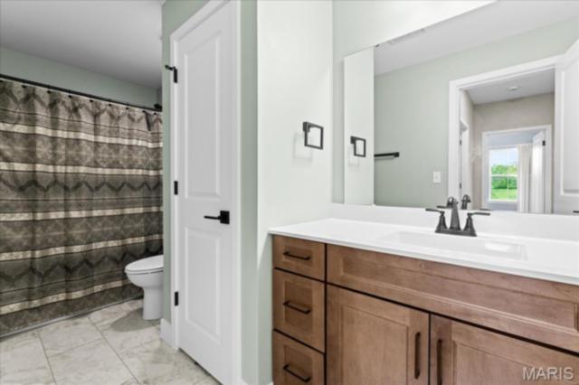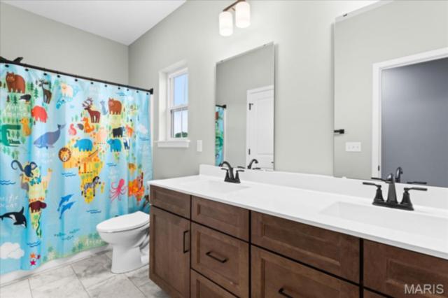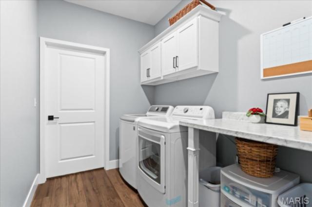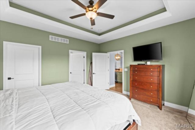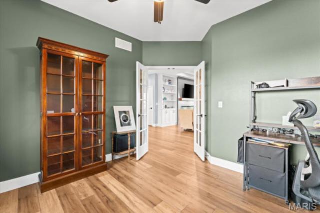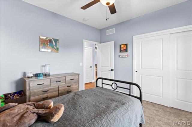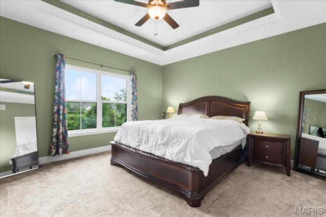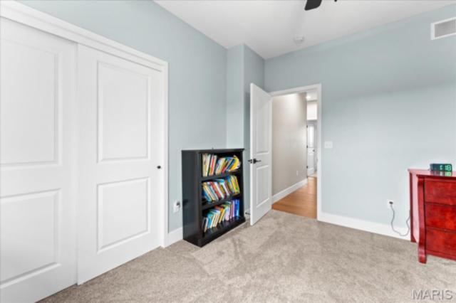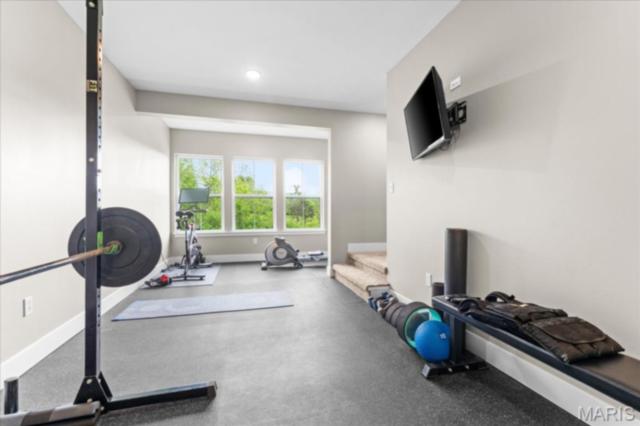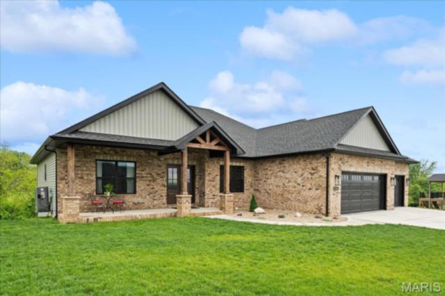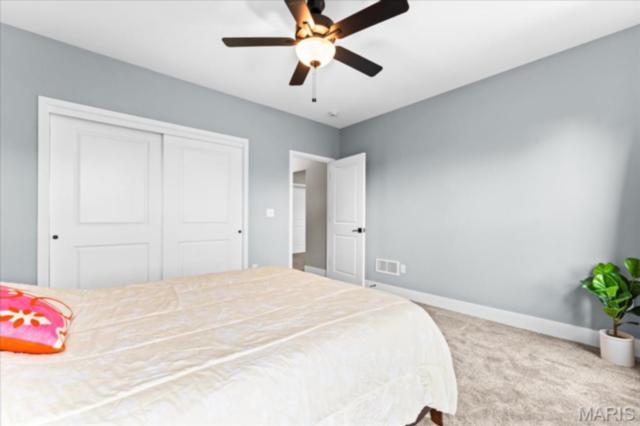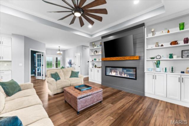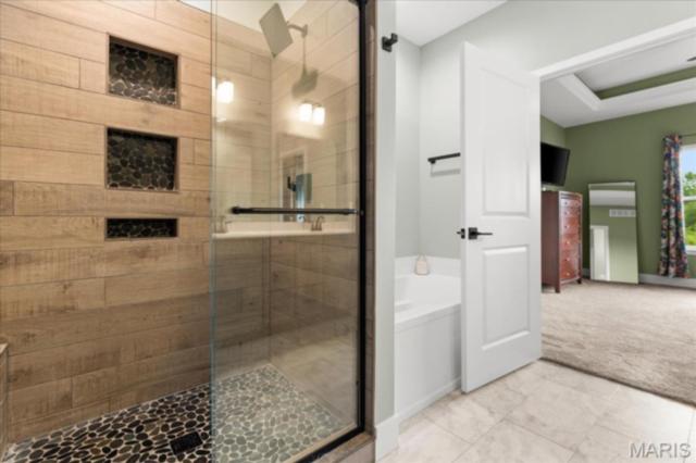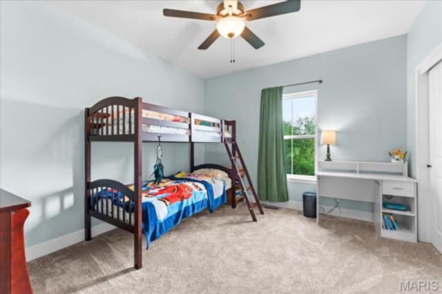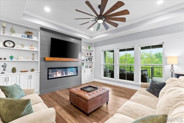 Gorgeous custom built home with a split bedroom floor plan and main level master bedroom. Tons of cabinet space in the kitchen with a large island, all soft close cabinets and drawers throughout, walk-in pantry with custom shelving that gives you lots of storage options, eat in dining area, and all kitchen appliances to stay. The kitchen opens to the spacious living room with electric fireplace and custom built bookcases. Not only are there stunning views from the living room and kitchen, but also from the primary bedroom. The main floor primary bedroom also has a spa-like bath including a walk-in shower with custom tile, garden tub, and a double bowl vanity. The large primary closet has custom shelving and drawers and connects to the laundry room that opens to the drop zone right off the 3 car garage. A front office space with french doors is off of the foyer entry which also leads to the two guest bedrooms along with a second full bath to round out the main floor The walk out finished basement offers an expansive living room, a home gym with rubber mat flooring and great views of the back yard, fourth bedroom, a second office space and a full guest bath. Don't forget about the high end LVP flooring on the main level, an oversized 3 car garage, fence, and upgrades galore. All of this on just over an acre lot on the cul de sac street, minutes to Scott Air Force Base, community pool, Shiloh/O'Fallon schools, along with great views from the back and views of the Arch from the front!